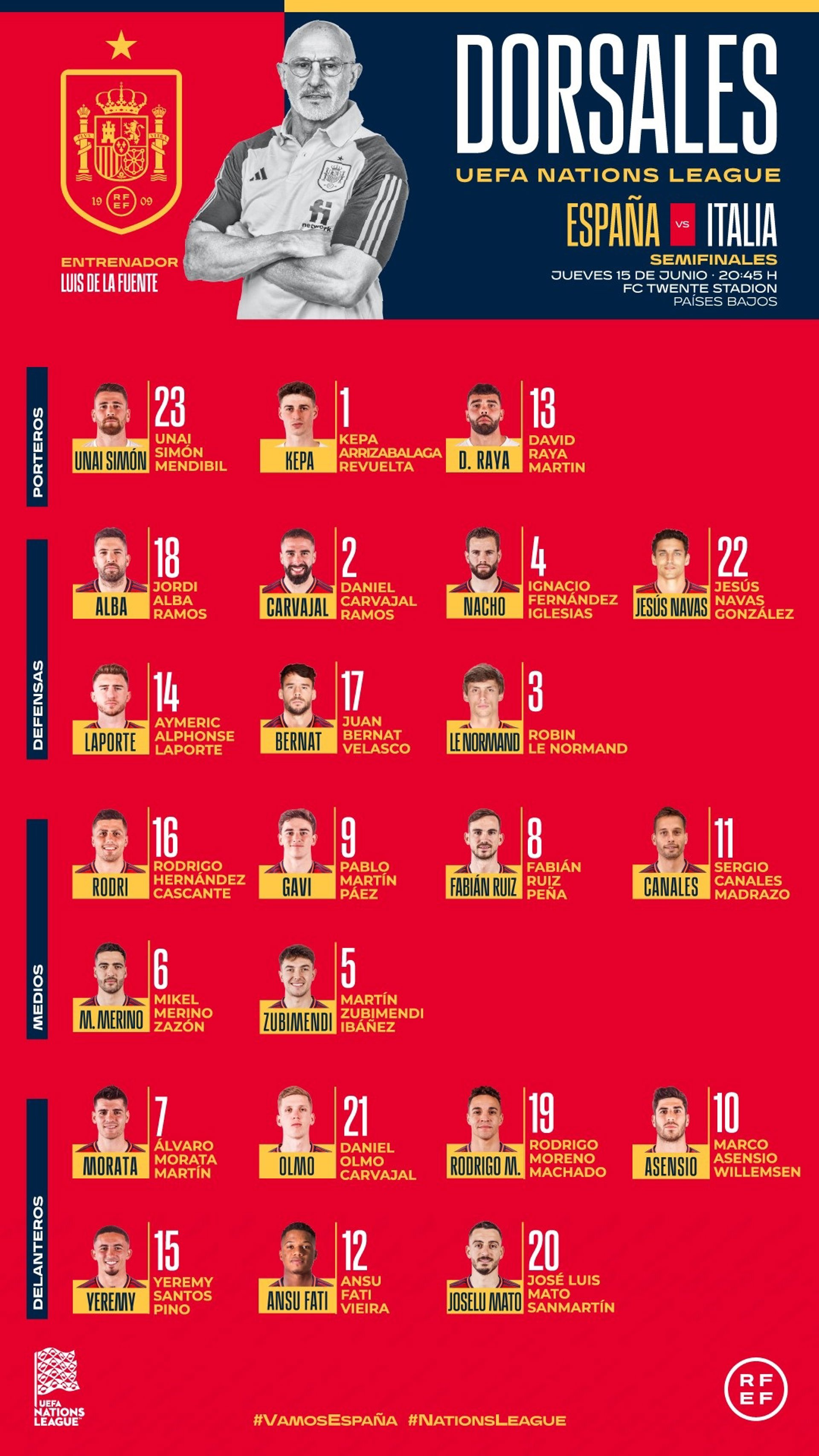 Entre los porteros, Unai Simón seguirá con el '23' y David Raya con el '13, y Kepa Arrizabalaga vestirá el '1'; en defensa, el '18' será para Jordi Alba, el '2' para Dani Carvajal, el '4' para Nacho Fernández, el '22' para Jesús Navas, el '14' para Laporte, el '17' para Juan Bernat y el '3' para Le Normand.