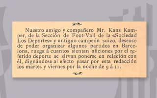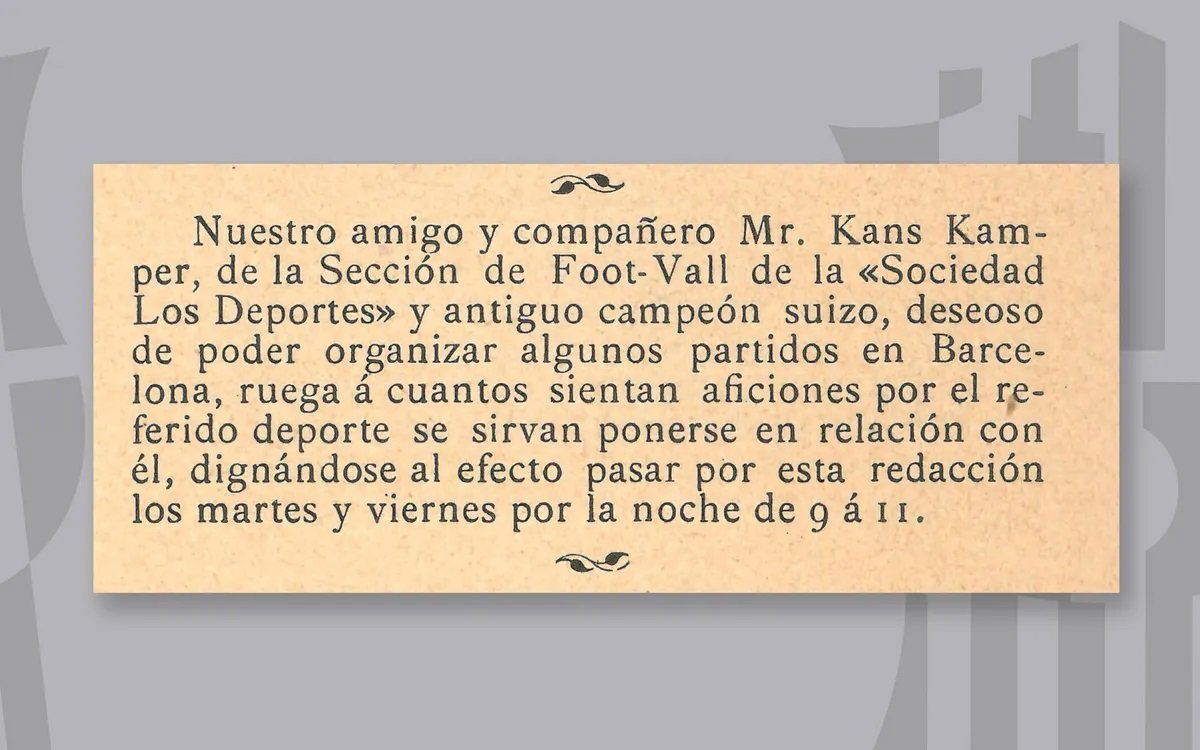 Hace exactamente 125 años, el 22 de octubre de 1899, se publicó un modesto anuncio en el seminario 'Los Deportes' que marcaría el inicio de una era deportiva en Barcelona. El suizo Hans Gamper, solicitó a través de esta publicación la colaboración de los barceloneses para fundar un equipo de 'Foot-Vall', después de un intento fallido de organizar el deporte con los miembros del Gimnasio Toulouse.
