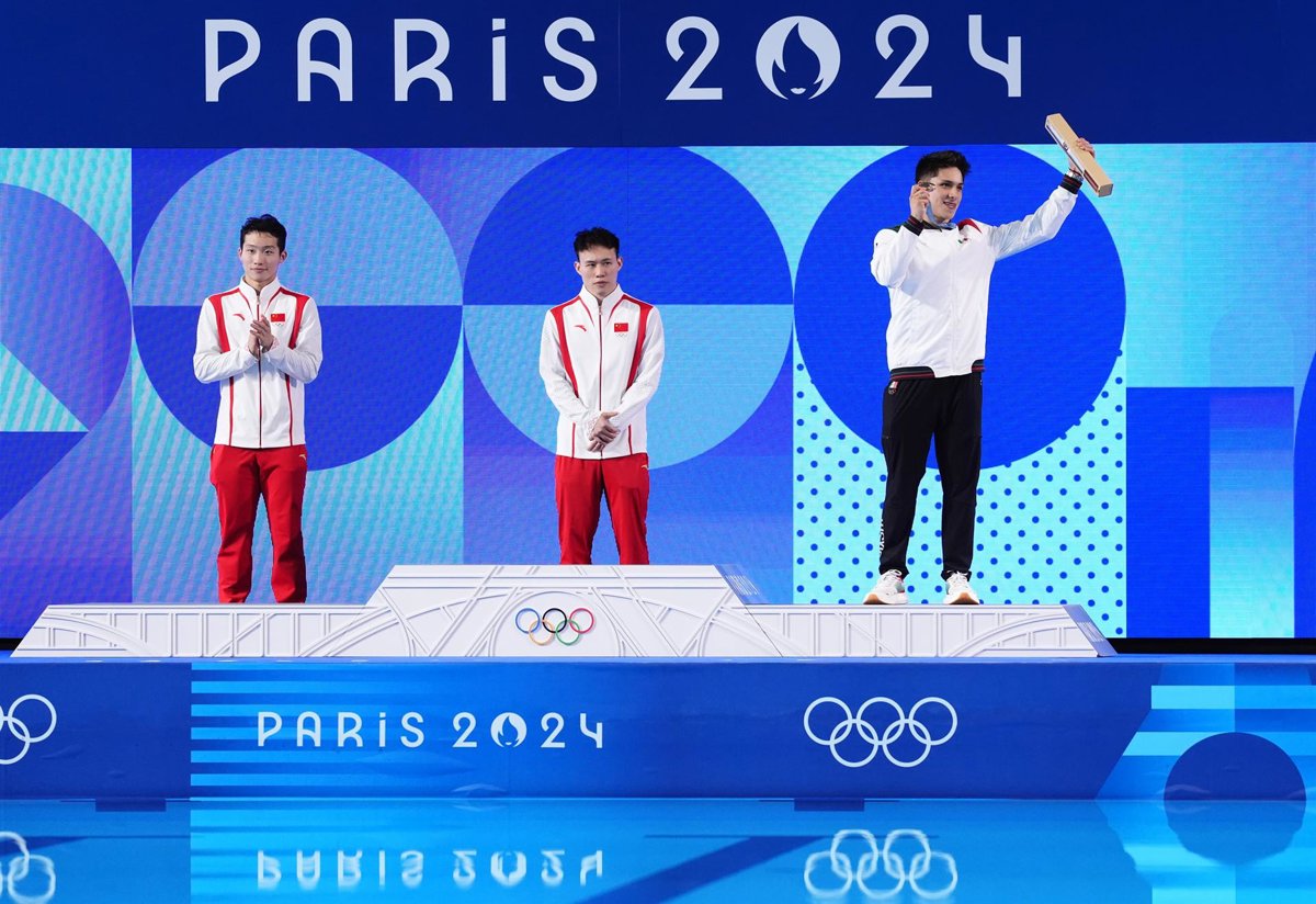 08 August 2024, France, Paris: (L-R) Silver medallist China's Wang Zongyuan, gold medallist China's Xie Siyi and bronze medallist Mexico's Osmar Olvera Ibarra. - John Walton/PA Wire/dpa