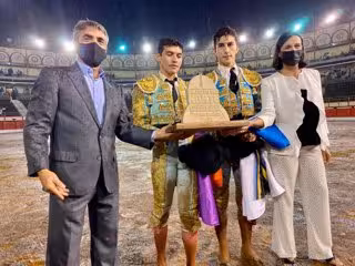 Archivo - En el centro los toreros Isaac Fonseca y Manuel Perera, ganadores del Circuito de Novilladas del Norte, junto a la alcaldesa de Santander, Gema Igual, y el presidente de la Fundación del Toro de Lidia, Victoriano Fuentes - AYUNTAMIENTO DE SANTANDER - Archivo
