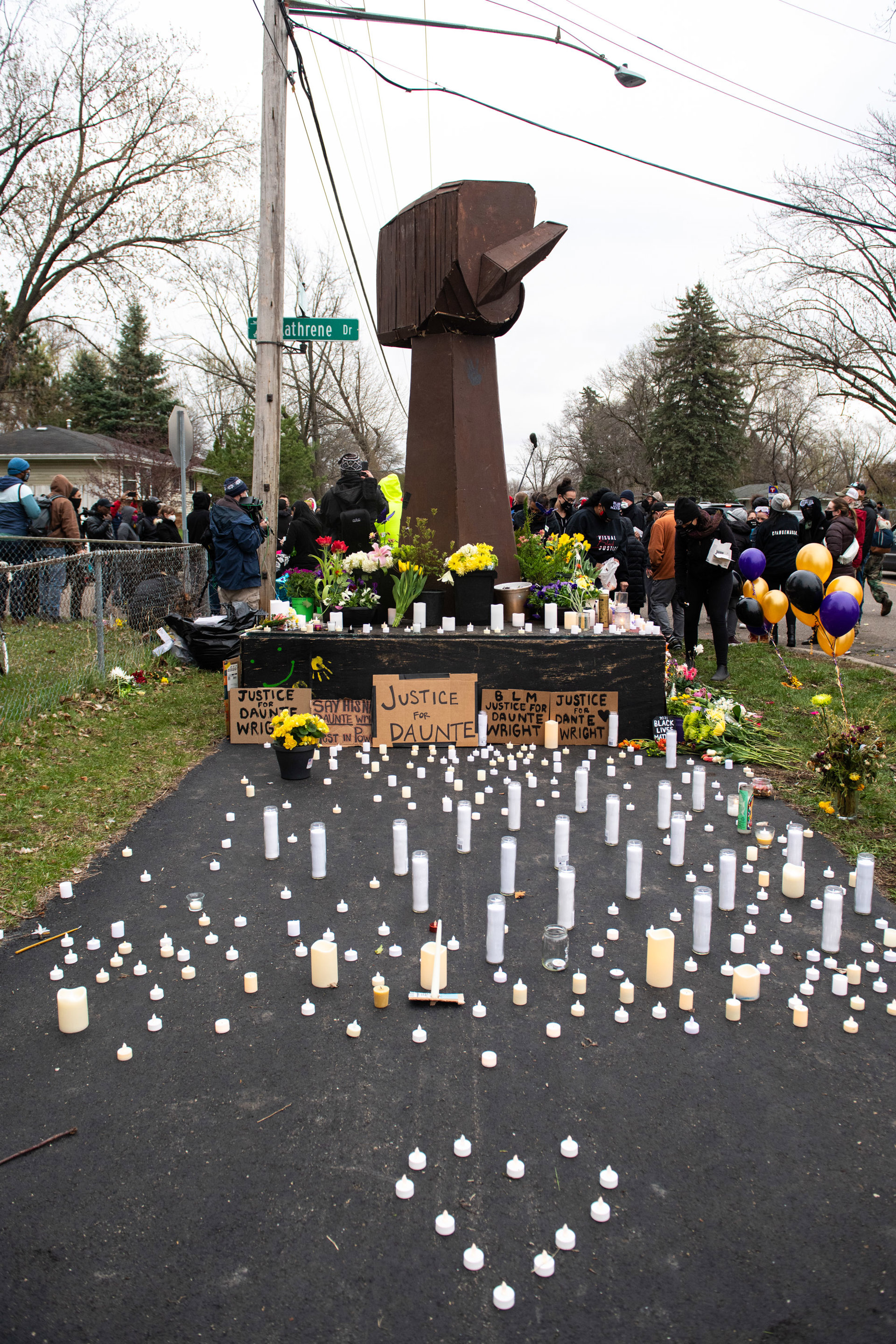 Archivo - Velas y flores depositadas en el suelo frente a un cartel del movimiento Black Lives Matter durante una vigilia en recuerdo de Daunte Wright en el lugar donde fue tiroteado mortalmente.