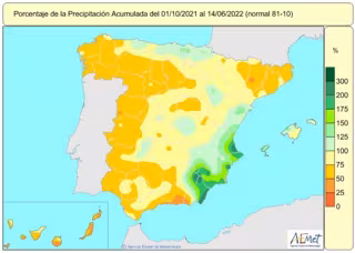 Las lluvias acumulan un 25% de déficit en el conjunto de España entre el 1 de octubre de 2021 hasta el 14 de junio de 2022. - AEMET
